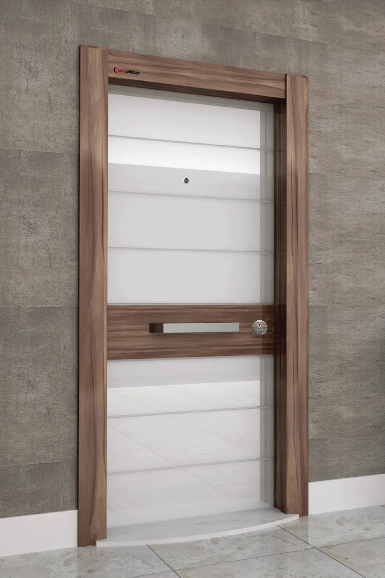 Special fuga designed fitted glass surface over front steel leaf middle part of door has extra 1 mm steel PVC lamination decorative panel